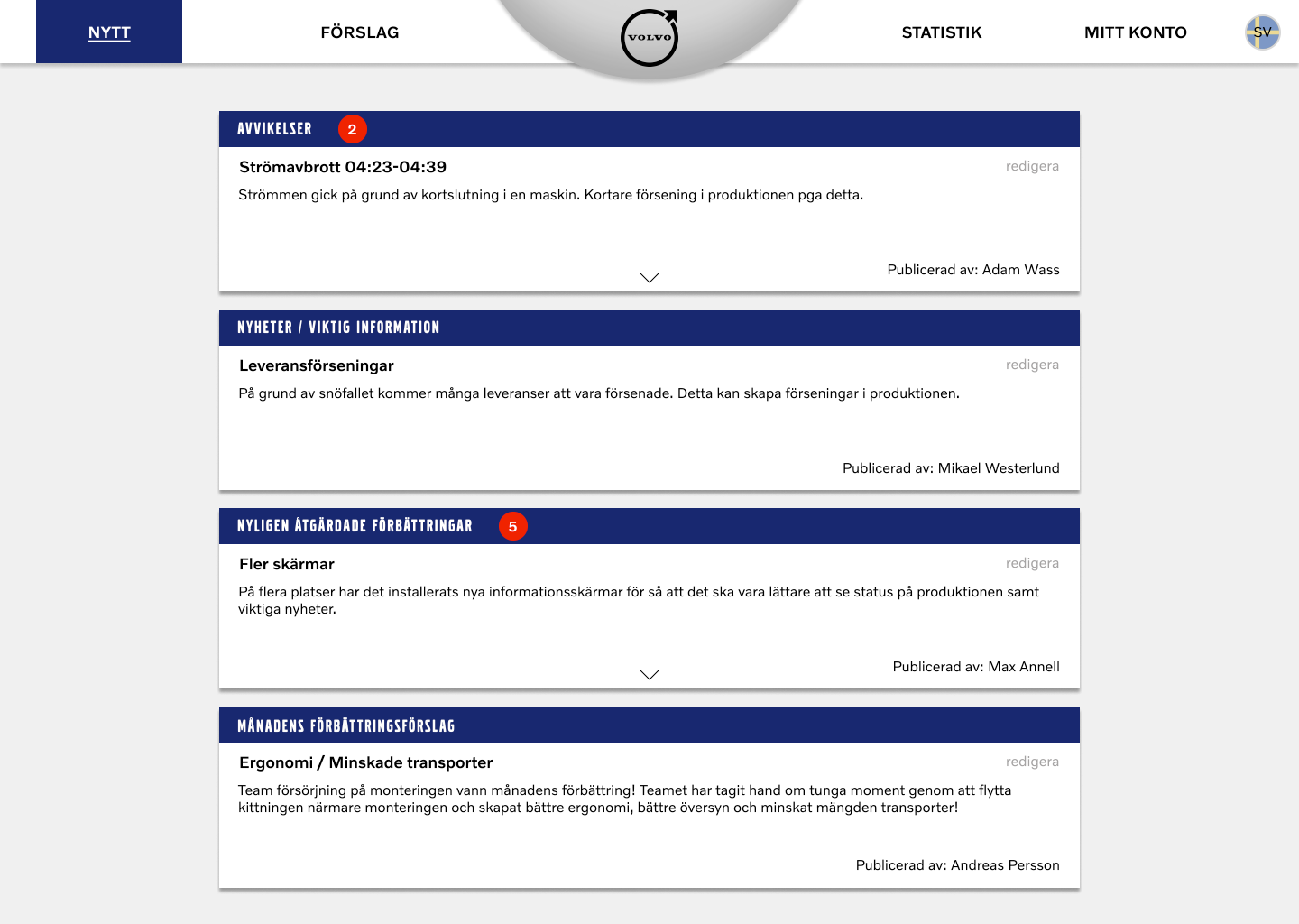 På uppdrag av Volvo CE i Arvika, i samarbete med Changemaker Educations, arbetade min klass med att förbättra Volvo CE:s förslagsinlämningsprocess. Volvo CE hade noterat en minskning av antalet inlämnade förslag och ville adressera detta. Vi delades in i grupper om 4-5 personer, och min grupp valde att utveckla en digital lösning i form av ett nytt intranät för Volvo CE. Läs mer.