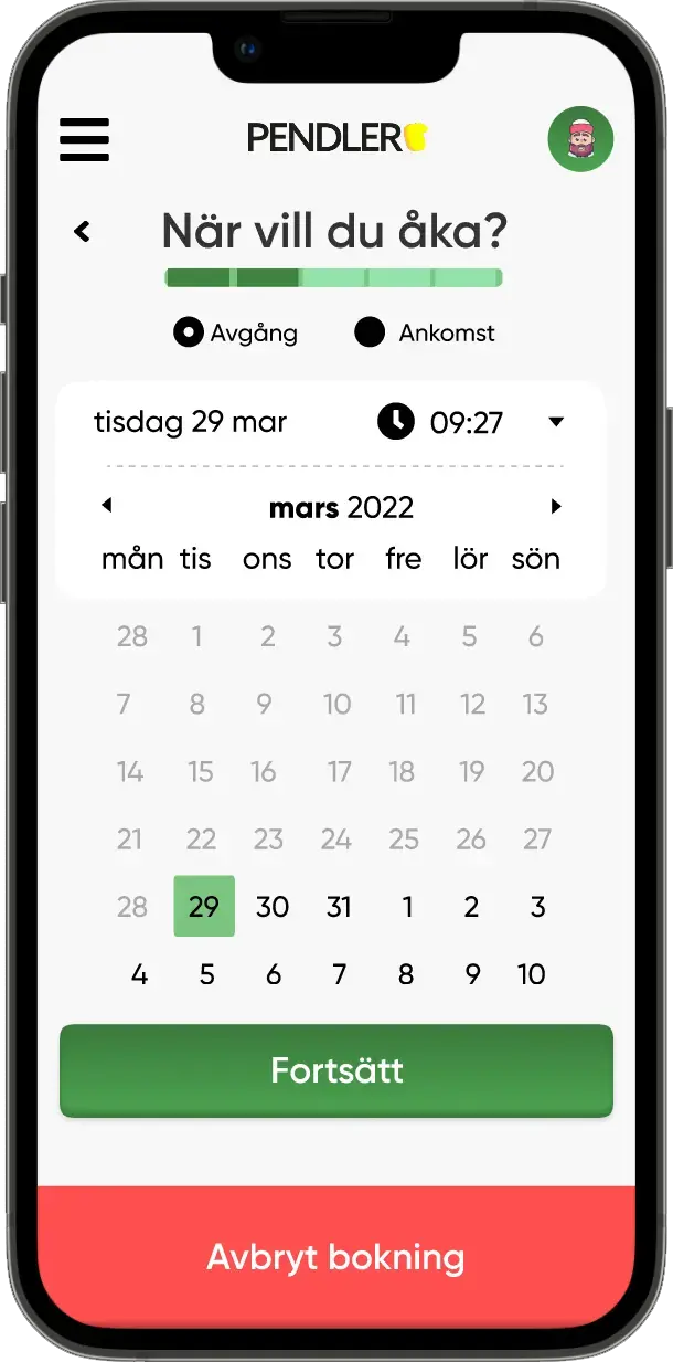 Hur det ser ut när man väljer datum och avgångstid för ens resa.